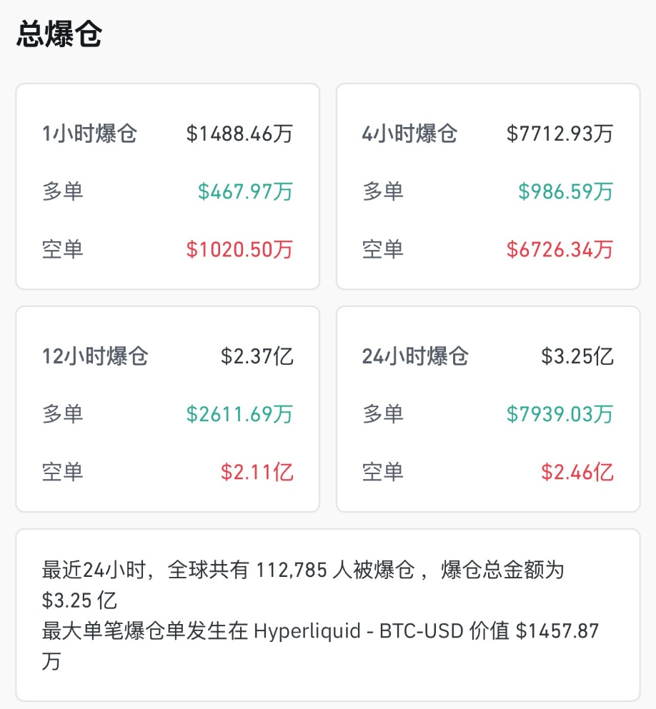Coinglass数据显示,最近24小时加密货币市场超11万人爆仓,爆仓金额达3.25亿美元。