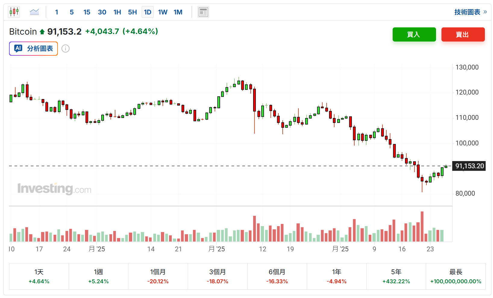 11月27日,比特币 (BitfinexUSD)大升4.6%,站上9.1万美元。